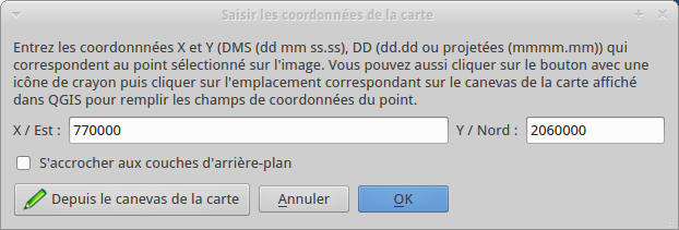 - Le clic gauche dessine le point de calage et provoque l'ouverture de l'interface de saisie des coordonnées